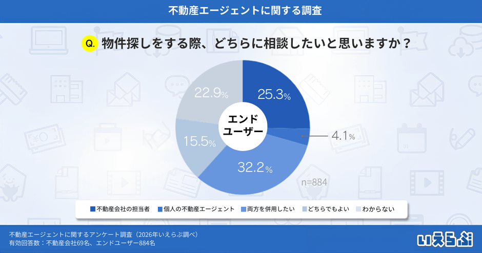 「物件探しをする際、どちらに相談したいと思いますか?」という質問では、「不動産会社の担当者」(25.3%)、「個人の不動産エージェント」(4.1%)、「両方を併用したい」(32.2%)、「どちらでもよい」(15.5%)、「わからない」(22.9%)という結果となりました。