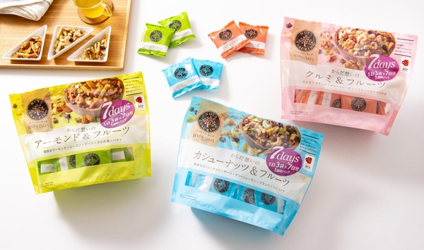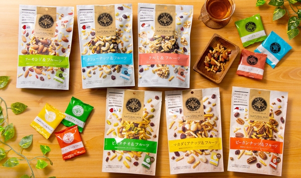 ナッツスナッキングシリーズとは、ナッツと食べ合わせの良いドライフルーツを混合し、素材のおいしさを活かした体に優しい健康応援のおやつです。食べきりやすく持ち運びしやすい“個包装タイプ”であることが特徴です。27種類と豊富なラインナップで、日々の習慣にしていただきやすいシリーズとなっております。
