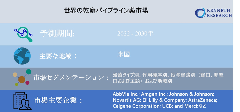 リサーチ・ネスターの一部門であるケネス・リサーチは、2022年1月12日に「世界の乾癬パイプライン医薬品市場:世界の需要分析と機会見通し2030」と題する調査レポートを発表しました。詳細な市場業界の需要分析と、市場の成長に影響を与えるさまざまな要因を提供します。このレポートは、予測期間、市場価値、市場規模、成長率、セグメント、市場プレーヤー、成長ドライバーなど、市場の成長を提供します。調査方法には、市場評価と予測データ計算に基づいて過去および現在のデータを収集することが含まれます。このレポートのデータ収集には、一次調査と二次調査の両方が含まれます。