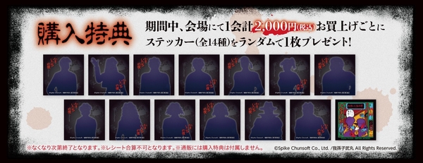 期間中、会場にて税込2,000円お買い上げごとに特典ステッカー(全14種)をランダムで1枚プレゼントいたします。