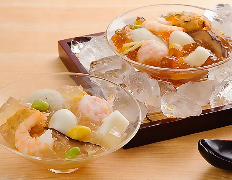 ひんやりぷるぷるのジュレタイプの出汁の中に食べやすい一口サイズの具材が入っています。