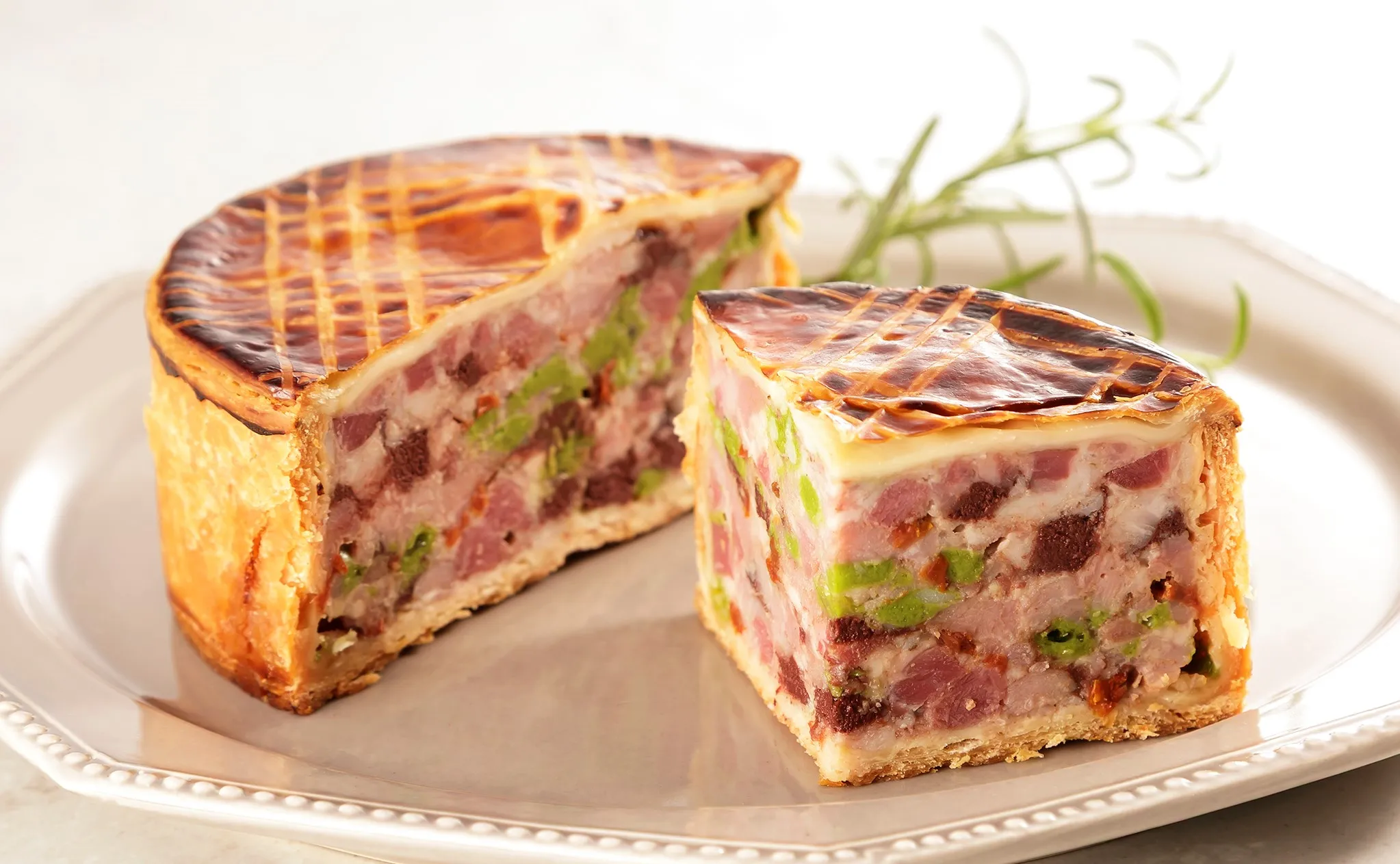 豚のモモ肉、バラ肉などに加え、パセリのジュレ、ドライトマトなどを生地のなかに閉じこめました。