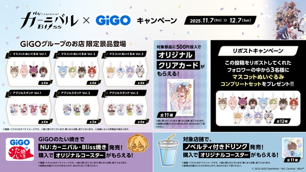 株式会社GENDA GiGO Entertainment(本社:東京都港区 代表取締役社長:二宮 一浩、以下「当社」)は、GiGOグループのお店におきましてDarkWindが提供するBLキャラクタースマホゲーム『NU: カーニバル - Bliss』とコラボした「NU: カーニバル – Bliss × GiGOキャンペーン2025」を2025年11月7日(金)より開催いたします。