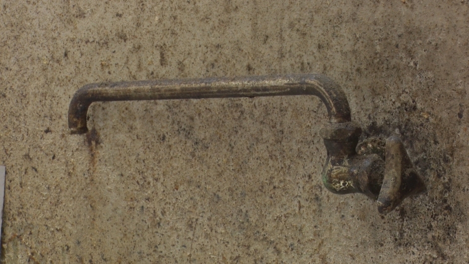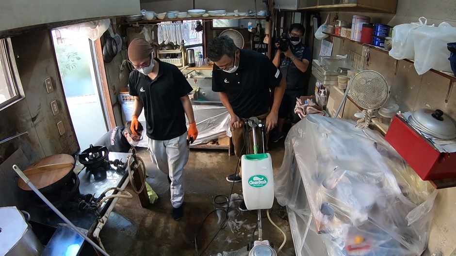 藤本さんたちがきれいにするのは、旦那さんとの思い出が詰まった厨房。油汚れが蓄積した換気扇、レンジフード、調理台、元々の色がわからなくなるほど汚れた蛇口、黒く変色したコンクリートの床です。