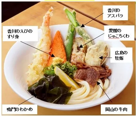 瀬戸内の具材を豪快に盛り付けたうどんが登場。