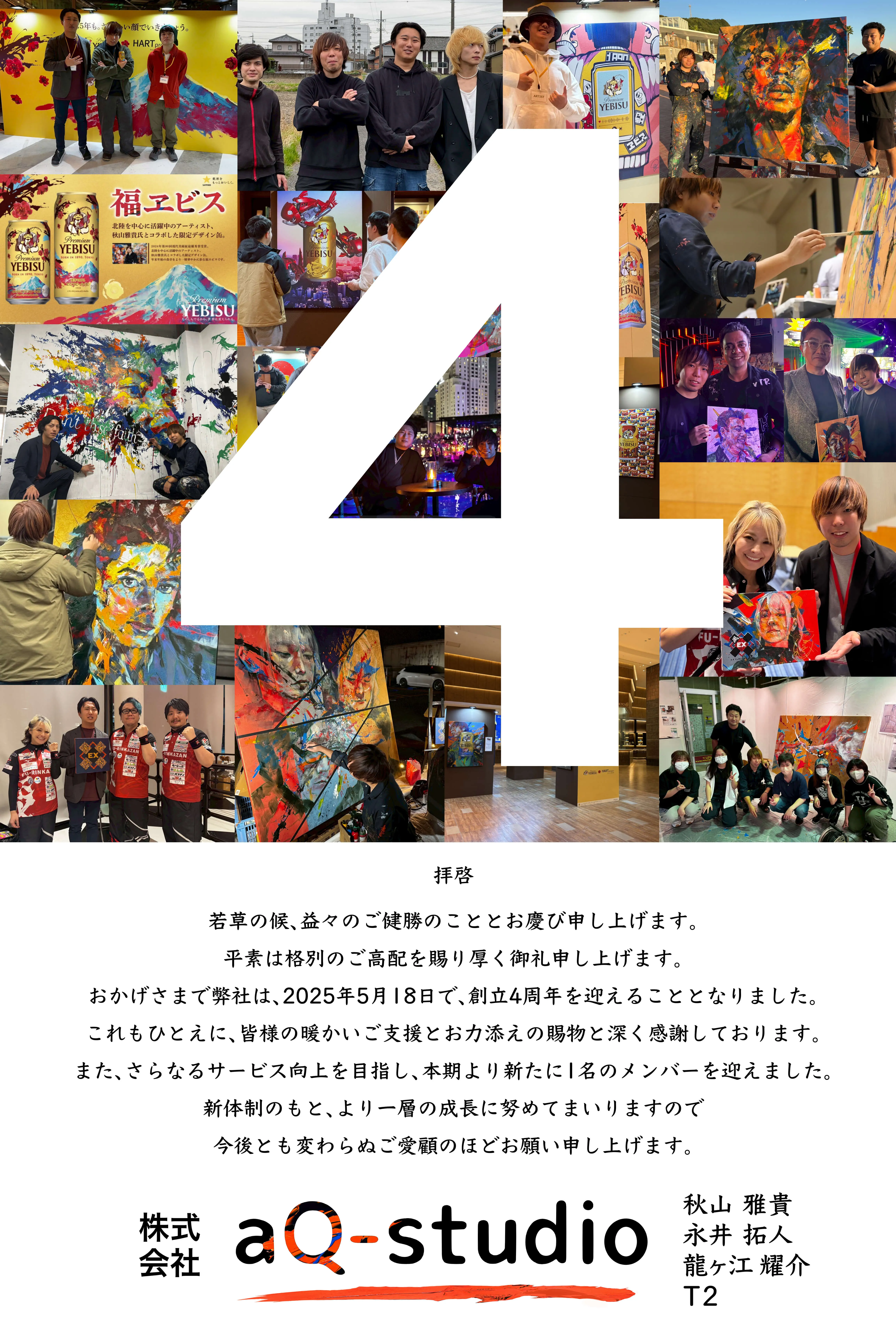 「おかげさまで、株式会社aQ-studioは4周年を迎えることができました。振り返れば、創業以来たくさんの方々とのご縁をいただき、多くの挑戦と経験を積ませていただきました。この場を借りて心より感謝申し上げます。