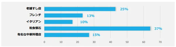 記念日に行きたいレストランは、「和食懐石」が約4割で最多、次いで「老舗すし店」ということから、富裕層は“和のおもてなし”を求める傾向にあるようです。