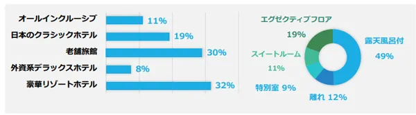 ・豪華リゾートホテルへの関心や、老舗旅館、露天風呂付の需要が高いことからから、特別感のある宿泊施設を用意。昨今人気の高い「オールインクルーシブ」タイプに宿泊する商品も揃えました。