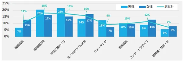 富裕層の方は、「美術館訪問」や「寺社仏閣めぐり」等、文化的なことに興味を持っているようで、「食べ歩きやグルメ旅」への興味は女性が男性を上回りました。