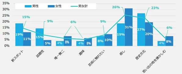 旅行で行きたい・体験したいのは「絶景」「天体・星空観測」「美術館」が上位に上がりましたが、その理由では男女で違いがみられました。男性が「歴史文化】【新スポット」を重視するアクティブな志向を示した一方、女性は「癒し」を求める回答が多かったのは興味深い結果です。