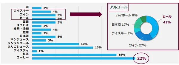 ・アルコール上位を聞いたところビールが1位で4割を占め、2位ワイン、3位日本酒。