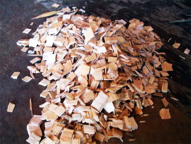 ③搬出された木道は金属探知機で釘などの異物が残っていないか調べた後、チップにするための機械に投入されます