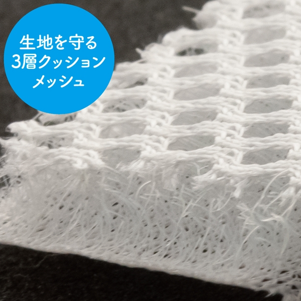 〇生地を守る3層クッションメッシュで生地を優しく守る。