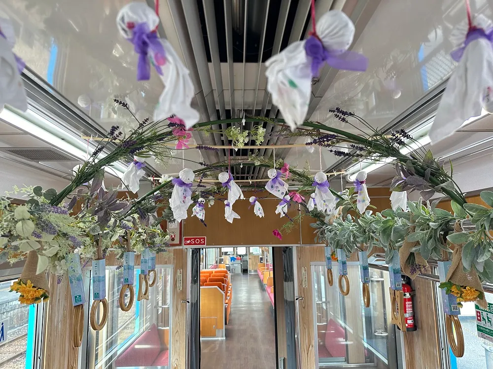 飾付を行うのは、「銀河鉄道999」で有名な漫画家 松本零士さんデザインのグリーン忍者列車と、伊賀鉄道のマスコットキャラクターをデザインした、ふくにん列車「伊賀の四季」号の車内で、2両編成の内、伊賀上野寄りの1両です。ラベンダーカラーをイメージしたナチュラルな飾付と、素敵な香りが広がる車内で、梅雨のどんよりした気分を解消し、リフレッシュしていただけます。