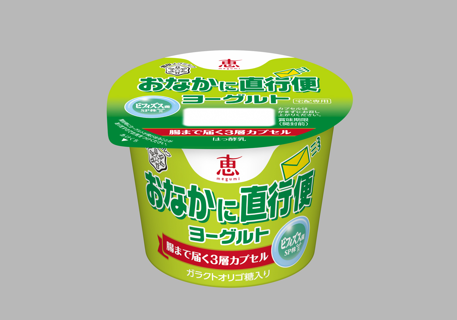 このたびリニューアルする『恵 megumiおなかに直行便ヨーグルト』は、腸溶性カプセルがビフィズス菌SP株を胃酸から守って、腸まで届ける当社独自のヨーグルトです。機能性ヨーグルトとして毎日続けて食べやすいように、すっきりとしたおいしさを保ちながらマイルドなミルク感を引き立たせた風味に改良しました。またカプセルの量を増やし、機能感を高めました。ビフィズス菌の栄養となるガラクトオリゴ糖入りです。