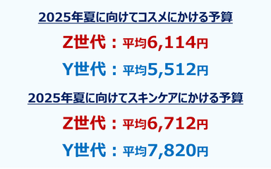 夏に向けたコスメ平均予算、Z世代は6,114円でY世代よりも高め。 一方スキンケア予算はY世代の方が高い傾向に