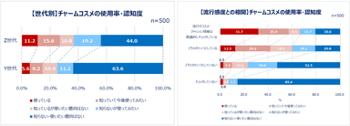 世代別で見ると、使用率・認知度ともにY世代よりZ世代の方が高い結果に。さらに「流行のコスメ・ファッション情報を意識的にチェックしているか否か」という質問への回答をもとに、流行感度別で見ると、コスメ・ファッションが好きな人ほど使用率も認知度も高いことがわかりました。