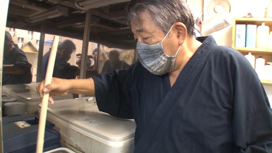 「焼肉のタレ」がついた表面を削ぎ落とし、約60年寝かせた固形石鹸などできれいにした後、染色補正を施す小林さん。