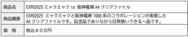 株式会社阪神コンテンツリンクでは、開催中の大阪・関西万博の公式キャラクターミャクミャクと阪神電車のコラボレーション商品を発売いたします。現在運行中の大阪・関西万博のラッピング車両や阪神電車の駅員さんに扮したミャクミャクのイラストをモチーフにしており、第一弾では全4商品を販売いたします。また、第二弾の商品発売も予定しておりますのでぜひ楽しみにお待ちください。