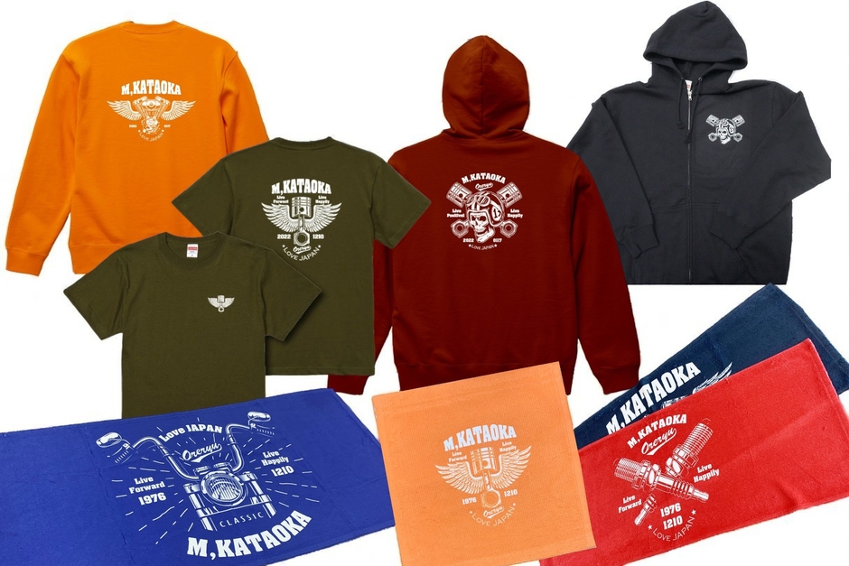 アメリカンシリーズは、カスタマイズ可能なデザインが特徴のラインナップです。デザインは12種類!バイクやエンジン、ピストンなど、アメリカンカルチャーにインスパイアされた力強いモチーフが揃っています。これらのデザインにお名前や日付を入れることができ、オリジナルのTシャツ、パーカー、タオルなどを作成できます。アメリカンスタイルのクールなアイテムで、個性を表現できるだけでなく、特別なギフトとしても喜ばれること間違いなしです。