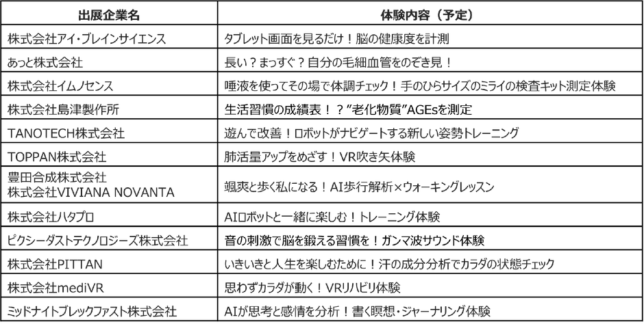 以下の企業が出展し、AIやVRなどの先端技術を使って、自身のカラダの状況を手軽に知ったり、新しい健康づくりが楽しめる12の体験ブースを展開します。