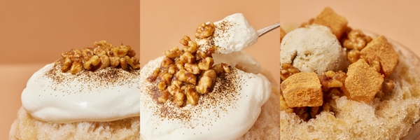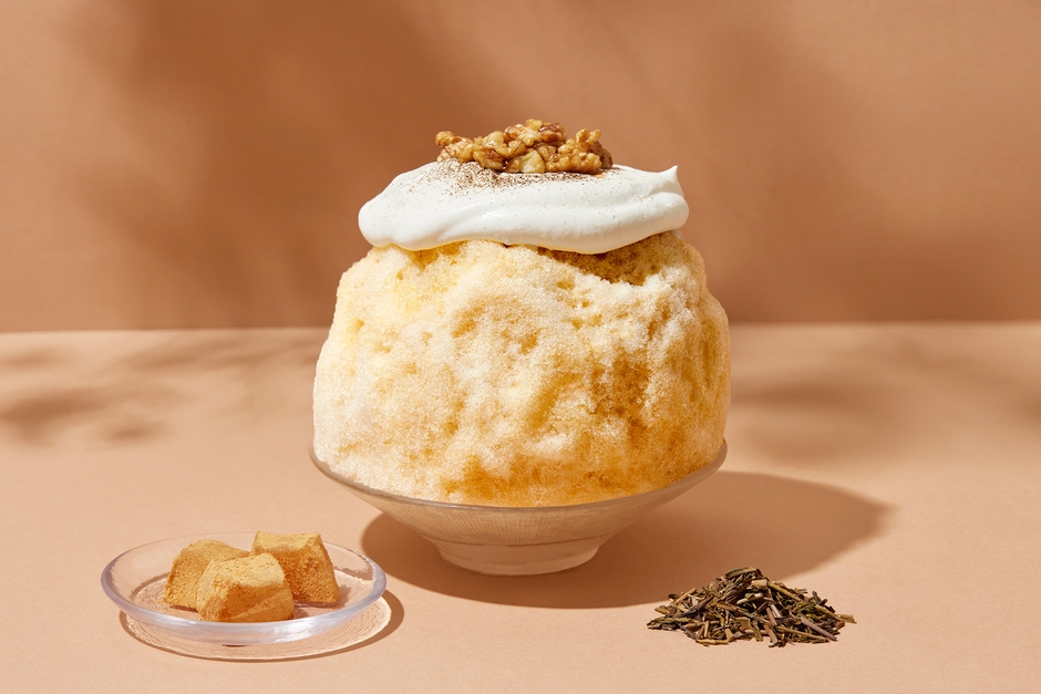 カフェで人気の「砂炒りほうじ茶」の茶氷です。煮出し製法で抽出した特製シロップをかけることですっきりとした焙煎香を感じられます。茶氷の中には同じく香ばしい風味の黒糖胡桃ときなこわらび餅、そしてぐり焙じ茶のジェラートが入っています。素朴で優しい甘さの中に、ふわふわの茶氷、カリッとした胡桃、なめらかなわらび餅、くちどけの良いジェラートなど、さまざまな食感のコントラストを味わえます。