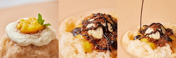 昨年好評だったまろやかな旨味の「かぶせ茶」を抽出した茶氷です。上質な西尾抹茶を使った濃厚な抹茶シロップを合わせ、ふわっと仕上げた自家製マスカルポーネクリームとあずきをトッピングしました。茶氷の中には濃厚な抹茶ジェラートのほか、やさしい甘さのあずきともちもち食感の白玉といった和の素材をバランス良く組み合わせた、王道の抹茶かき氷です。