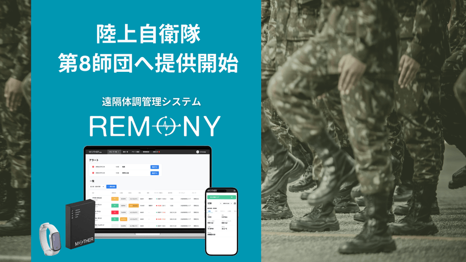 株式会社メディロム(本社:東京都港区、代表取締役:江口 康二、米国Nasdaq上場 NASDAQ: MRM、 以下「メディロム」)の子会社である株式会社MEDIROM MOTHER Labs(本社:東京都港区、代表取締 役社長:植草 義雄、以下「マザーラボ」)は、充電不要のスマートトラッカー「MOTHER Bracelet ®」を用いた遠隔体調管理システム「REMONY (リモニー)」を、陸上自衛隊第8師団(本部:熊本県北区)へ提供開始したことをお知らせいたします。
