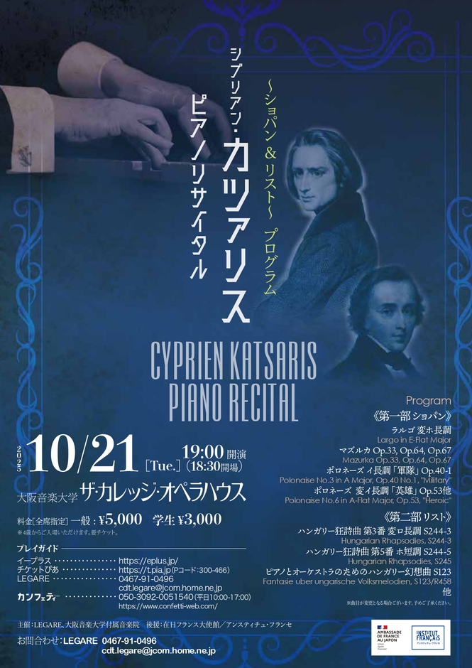 LEGARE・大阪音楽大学付属音楽院主催、『シプリアン・カツァリス ピアノリサイタル~来日40周年 ショパン&リスト プログラム~』が2025年10月21日(火)に大阪音楽大学ザ・カレッジ・オペラハウス(大阪府豊中市庄内西町1丁目7-12)にて開催されます。