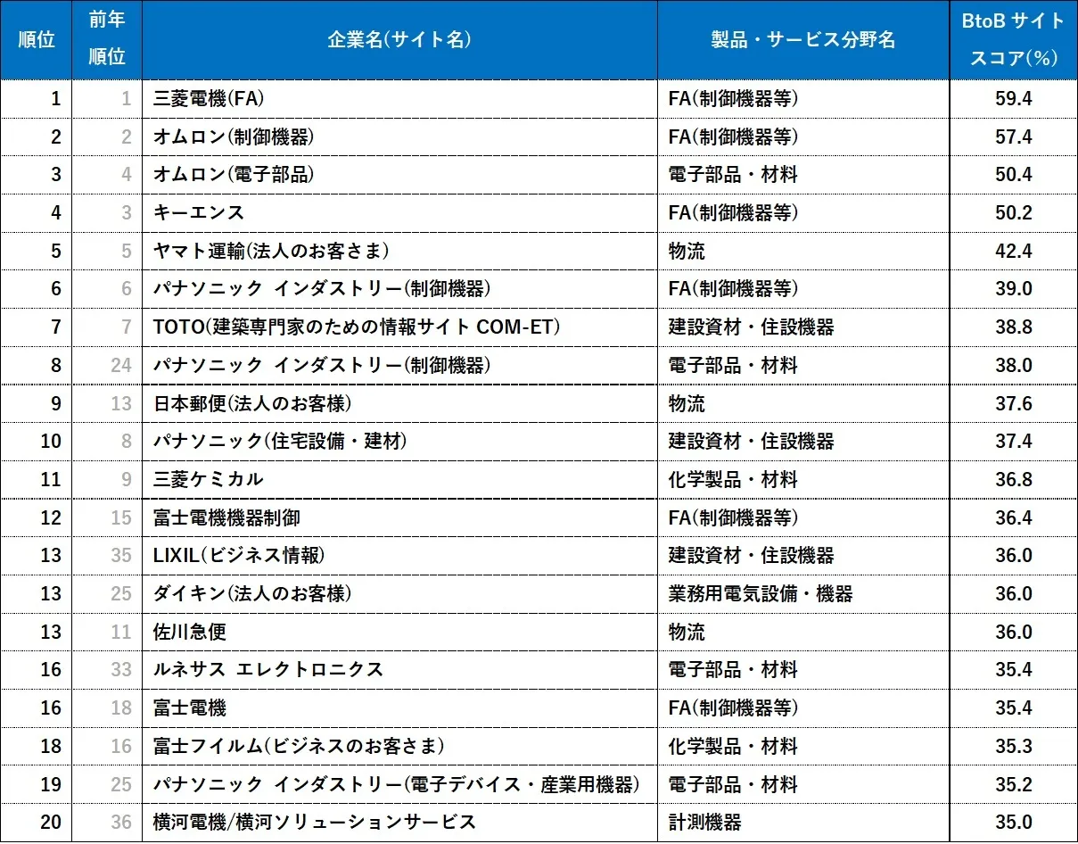 BtoBサイトスコアランキングは3年連続1位三菱電機(FA)。アクセス率上昇をうけ、3位のオムロン(電子部品)をはじめ電子部品・材料分野の4社がトップ20入り。