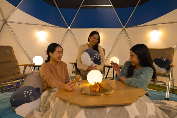 ふぐの形をした「ふぐテント」が広大なガーデンエリアみやぐりんに出現します。全長5メートルのものが1基と、全長3.5メートルのものが2基と大小異なるふぐテントが並ぶ姿はまるでふぐの親子のよう。全長5メートルのテントの中には最大8人、全長3.5メートルのテントには最大6人まで入ることができ、ゆっくりと暖をとれるようこたつやクッションなどを用意しています。冷えた身体をテントの中で温めながらリラックスし、日常とはひと味違った特別な時間を過ごすことができます。