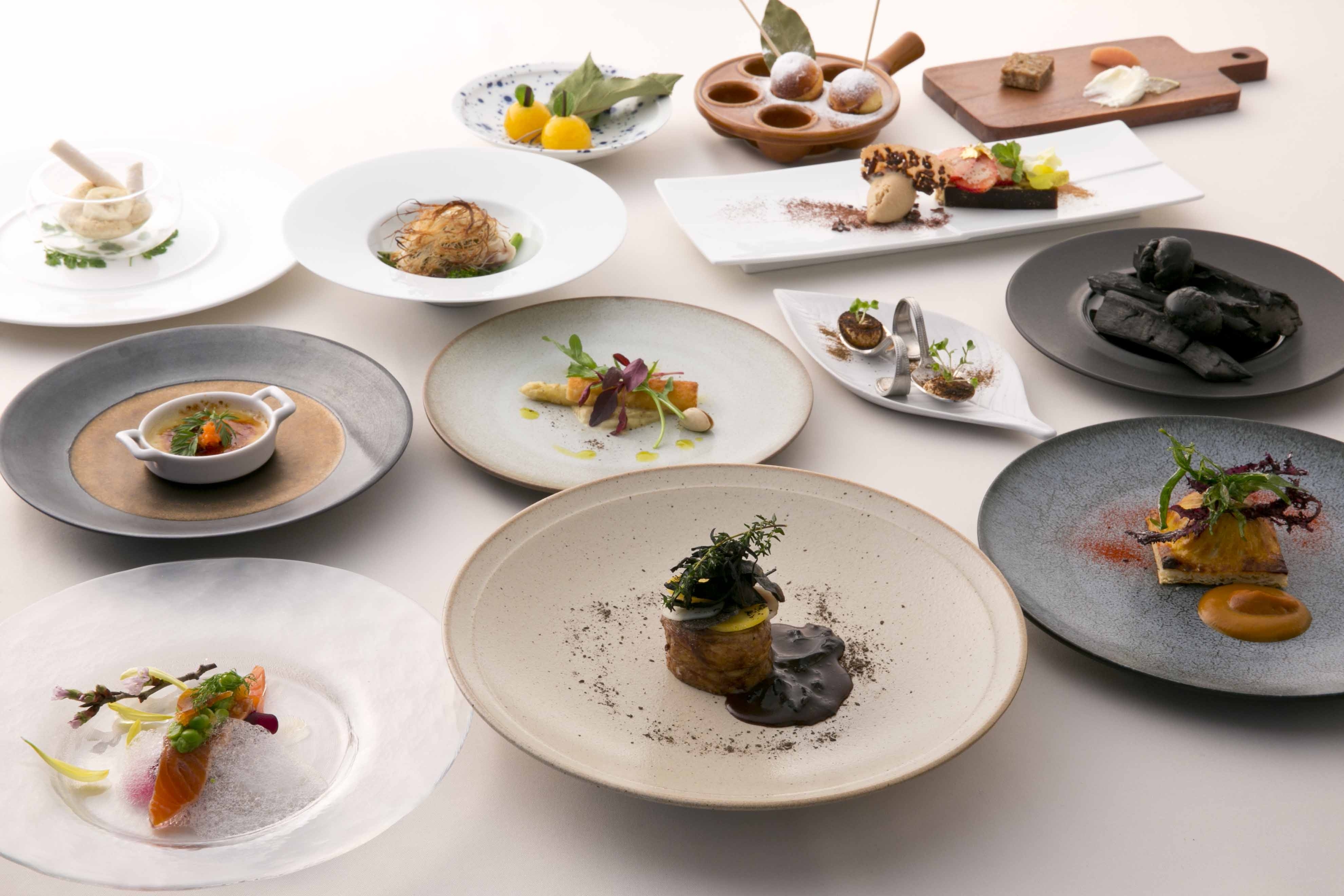 アミューズ、前菜、季節の野菜料理、オマール海老料理、魚料理、口直し、肉料理、プレデザート、デザート、プティフールからなる、小さなポーションのお皿の連続の中に、現在進行形の北欧料理の姿を凝縮。「五感でお楽しみいただく」ことをコンセプトに、皿上でのプレゼンテーションのみならず、スタッフがテーブルで盛り付けるなど視覚的に楽しめる料理等をはじめ、聴覚、触覚、臭覚、味覚、それぞれに訴えかける料理としました。また、春の食材を使用し、料理の明るい色味などで季節感も感じていただけます。各皿にマッチさせたワインペアリング(それぞれのお皿にあわせてグラスワインを少量ずつお楽しみいただけます6,200 円)もご用意します。