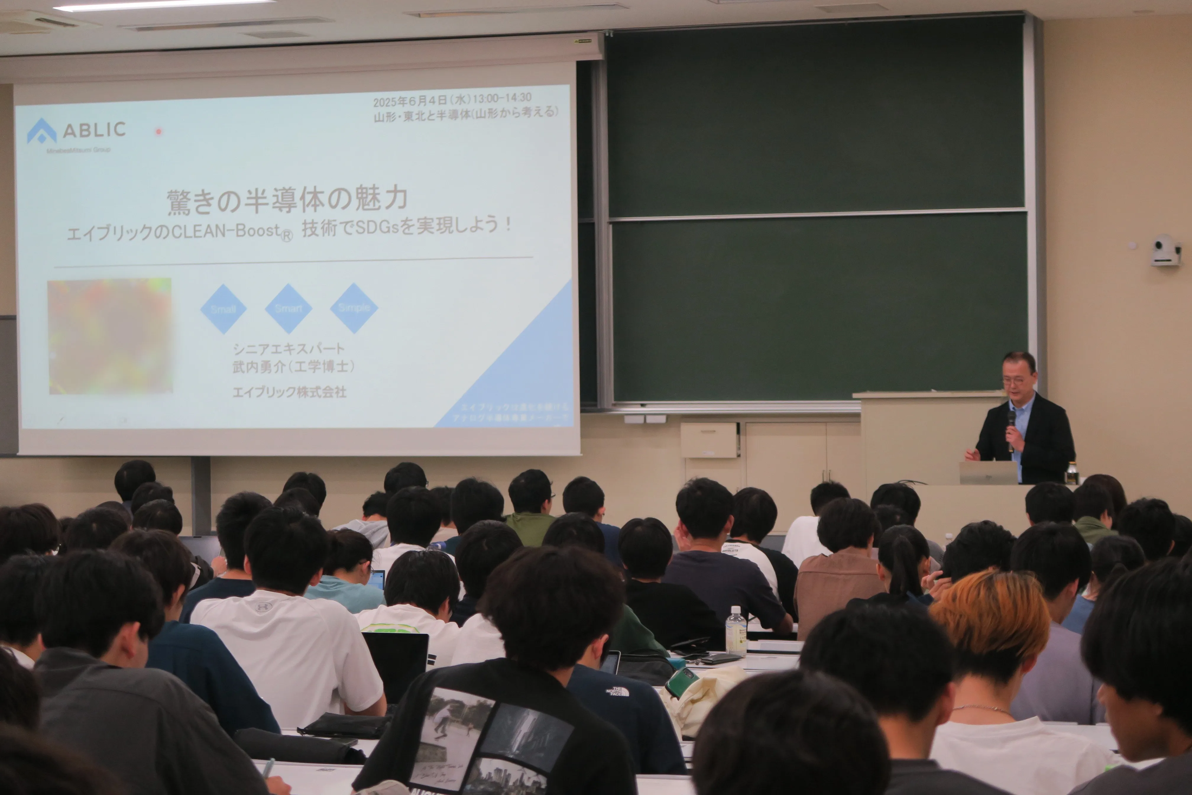 本授業は、山形大学と東北半導体・エレクトロニクスデザインコンソーシアム(以下、T-Seeds)(※1)が連携する講義「山形・東北と半導体」の一環として実施されたものです。山形県および東北地域における半導体産業の重要性が増す中、次世代を担う学生に、半導体への理解を深めてもらうことを目的としています。秋田県に製造拠点を構えるABLICは、T-Seeds会員企業として、この重要な取り組みに参画しました。