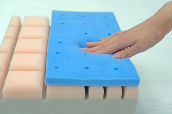 2種類の異なるウレタン(高弾性・高反発)を組み合わせた独自構造が、体圧を効果的に分散。さらに、部位ごとにブロック幅を変えた3次元カットにより、特に負担のかかりやすい腰まわりを重点的にサポートします。仰向け・横向き、どちらの寝姿勢でも自然な寝返りが打ちやすい設計です。