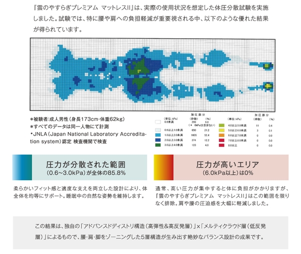 『雲のやすらぎプレミアム マットレスⅡ』は、体圧分散試験を実施した結果、