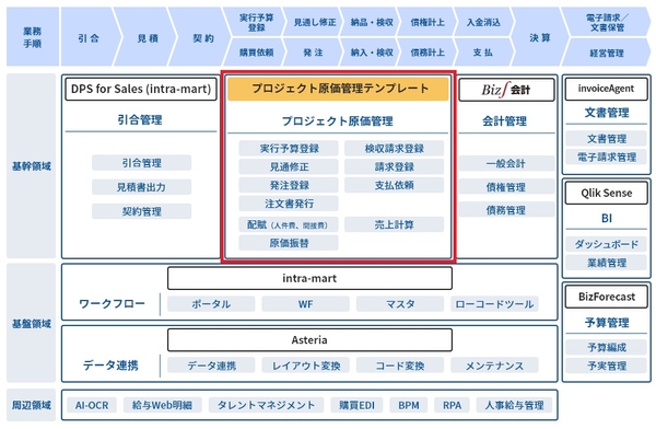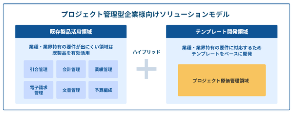 「Biz∫プロジェクト原価管理ソリューション」モデルでは、下記のように実行予算領域はテンプレートを提供し、お客様要件を踏まえたセミオーダーで対応します。その他の領域については以下に記載の製品を一例に、案件やお客様の状況に応じて既存製品の組み合わせや新規導入を行い、お客様固有の要件を踏まえたプロジェクト原価管理システムを実現します。