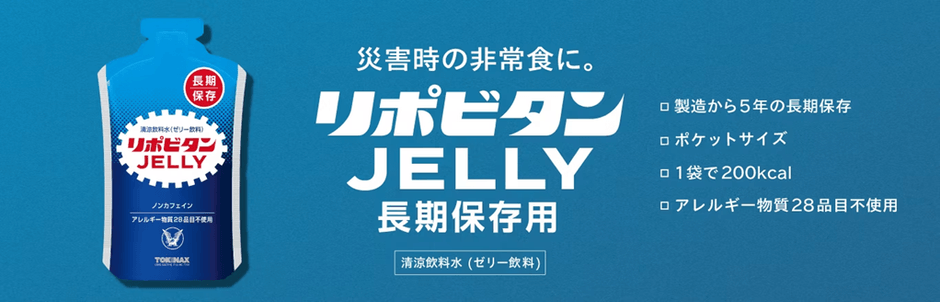 リポビタンゼリー長期保存用<清涼飲料水(ゼリー飲料)>は、5年間の長期保存を実現した、水分と栄養が摂取できる商品です。災害ストレスで食事も喉を通らないかもしれない、誰が口にすることになるかわからないなどといった「非常食の課題」を徹底的に考えて開発した誰でも食べやすいゼリー飲料となっています。