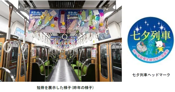 (2)内容 6507編成(3両編成)に「七夕列車」のヘッドマークを掲出し、また、車内に子どもたちの願い事やメッセージが書かれた短冊を貼付したポスターを展示します。
