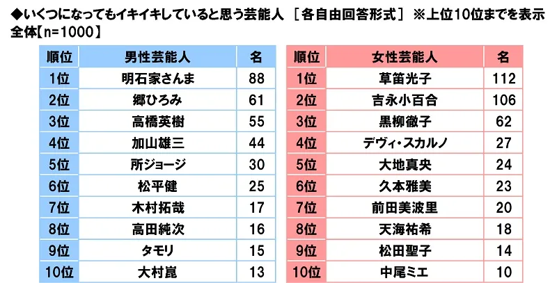 タニタ調べ いくつになってもイキイキしていると思う芸能人 男性芸能人では1位「明石家さんまさん」 2位「郷ひろみさん」3位「高橋英樹さん」、 女性芸能人では1位「草笛光子さん」 2位「吉永小百合さん」3位「黒柳徹子さん」