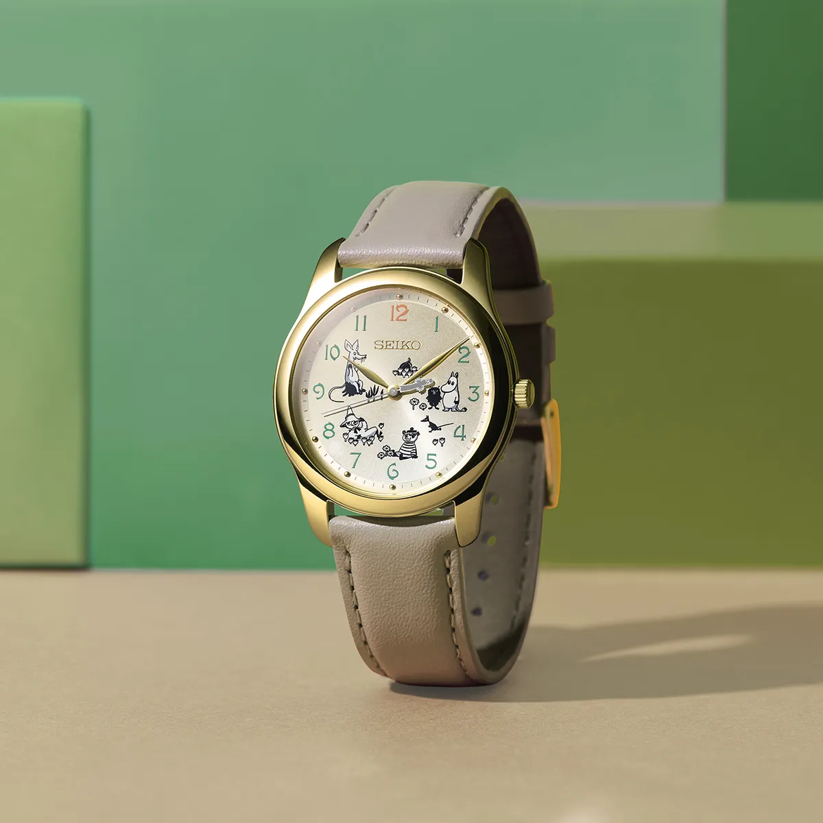 温かみのあるクリーム色の文字盤に集まった、愛らしいムーミン谷の仲間たち。
