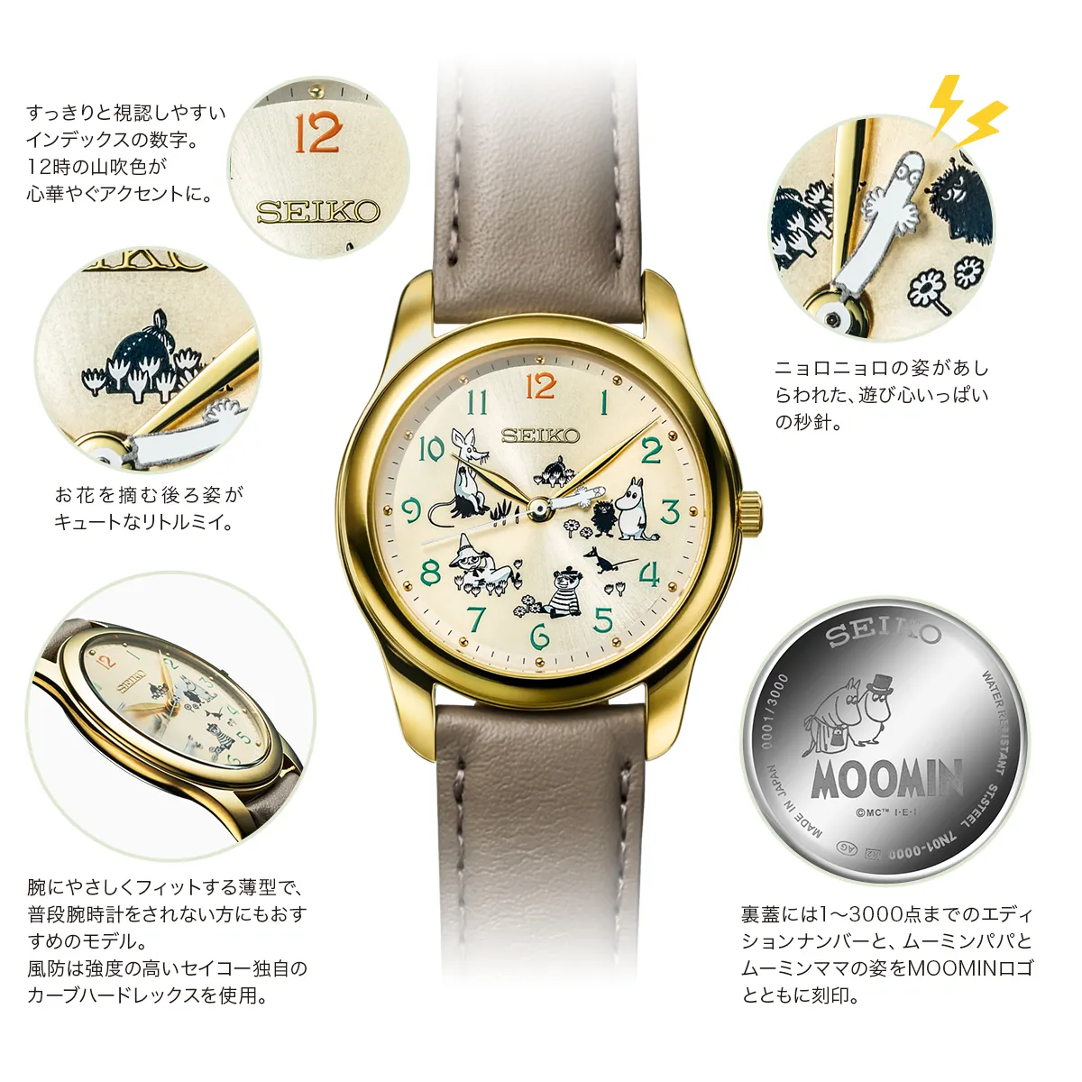 腕にやさしくフィットする薄型で、風防には強度の高いセイコー独自のカーブハードレックスを使用。秒針にはニョロニョロの姿があしらわれ、遊び心いっぱいです。