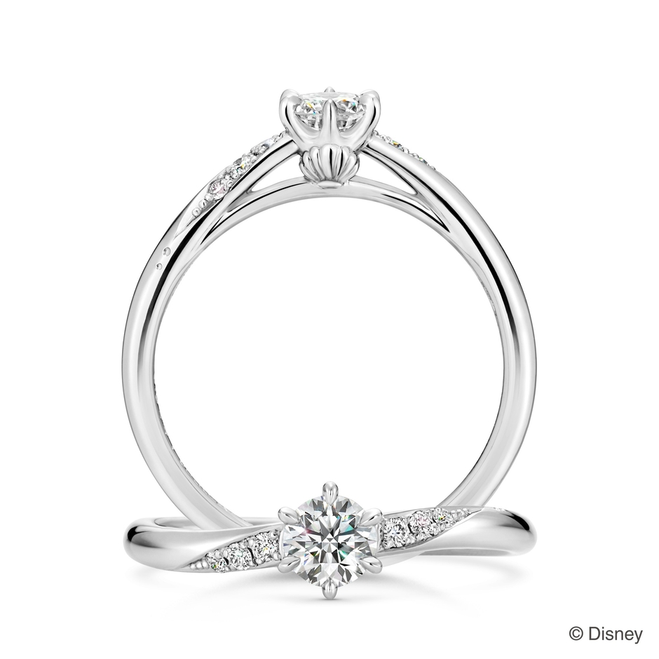 婚約指輪は、波を思わせるダイヤモンドの流れを美しくデザイン。側面には「貝殻」モチーフをさりげなくしのばせています。リング内側には、光に向かって泳ぐ「アリエル」のシルエットを刻印し、物語の象徴的なシーンを表現しています。