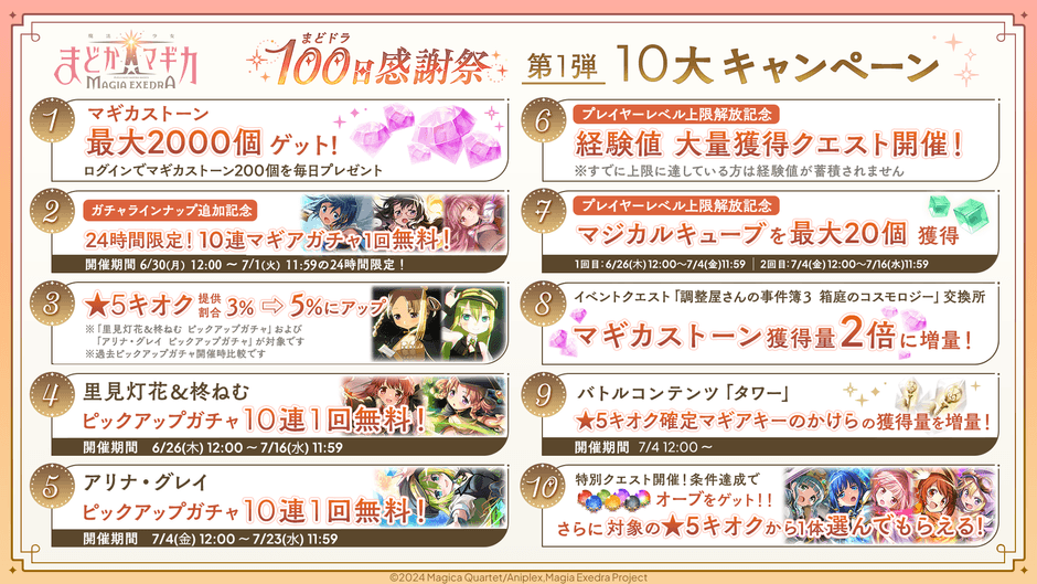 「魔法少女まどか☆マギカ Magia Exedra」はまもなくリリース100日を迎えます。リリース100日を記念して、6月26日(木)12時より、100日感謝祭 第1弾 10大キャンペーンを開催いたします。