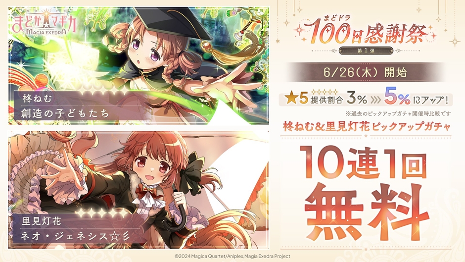 株式会社アニプレックス(本社:東京都千代田区 代表取締役 岩上敦宏 以下アニプレックス)は、『魔法少女まどか☆マギカ Magia Exedra』(Magia Exedra:マギアエクセドラ)において、6月26日(木)12:00より、「まどドラ100日感謝祭 第1弾10大キャンペーン」を開催することをお知らせいたします。第1弾の10大キャンペーンでは、ログインでマギカストーン最大2,000個獲得や、最大30連ガチャ無料など盛りだくさんの内容となっています。また、新★5キオク[ネオ・ジェネシス☆彡]里見灯花(CV 釘宮理恵)、[創造の子どもたち]柊ねむ(CV 諸星すみれ)、[Nine Phases]アリナ・グレイ(CV 竹達彩奈)が登場するピックアップガチャを開催することを決定いたしました。また、Steam版が2025年夏頃にリリース決定したこと、『劇場版 魔法少女まどか☆マギカ 〈ワルプルギスの廻天〉』との合同配信番組が決定したことをお知らせいたします。