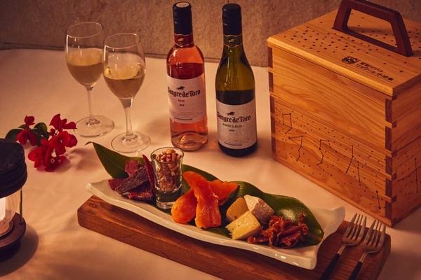 レストランで好みのワインを選んでテイクアウトできる「ワインボックス」を用意します。甘みのあるワインや渋みのあるワインをレストランで選び、ワインボックスに入れます。おつまみはどのワインともマッチするジャーキーやチーズなどを用意。満天の星と海の絶景を堪能しながら優雅な時間を過ごすことができます。