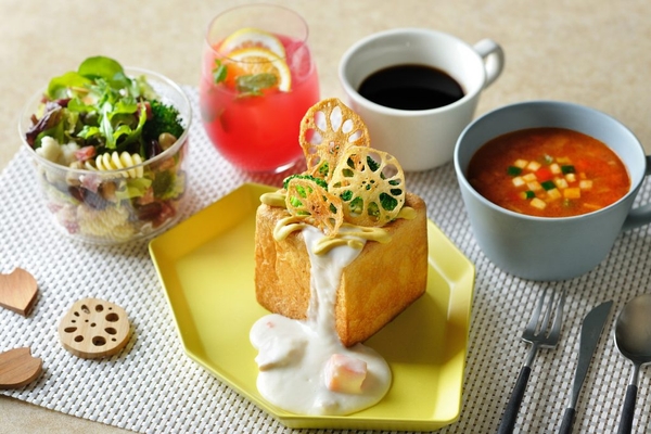 熊本の郷土料理「からし蓮根」から着想したメニューです。キューブ型のパンの中に、ぴりっとしたからしがアクセントのホワイトシチューがたっぷり入っています。トッピングは蓮根チップスで、パリパリとした食感が楽しめます。サラダとドリンクがセットになっており、街を楽しむためのエナジーチャージができる朝食です。