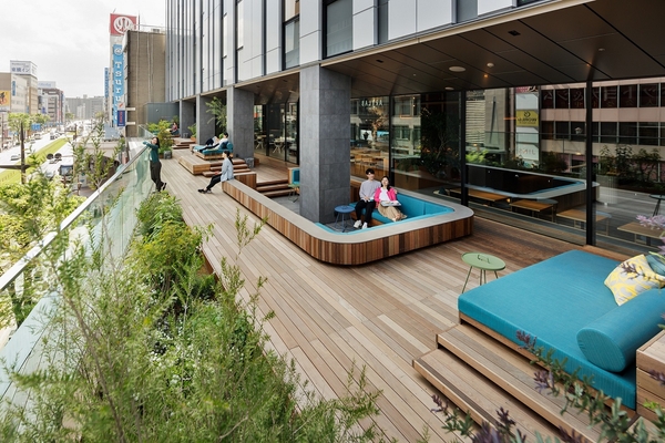 ホテルのパブリックスペースには、内外を繋ぐ立体的なデッキテラスを設けています。デッキテラスは、街の賑わいや、熊本城の風景をホテルと繋ぐための新たな地形として計画し、外部のテラスが、内部空間にまで入り込みます。地形のように凹凸のある凸凹(でこぼこ)テラスには、リラックスして城を眺めるソファや、家族や友人と会話や食事を楽しむカフェスペース、グループで集う溜まりの空間等、段差のある凹凸形状により様々な居場所を設けています。また、四季により移ろうテラスの植栽は、内部にまで繋がり、心地よい領域をつくりだします。