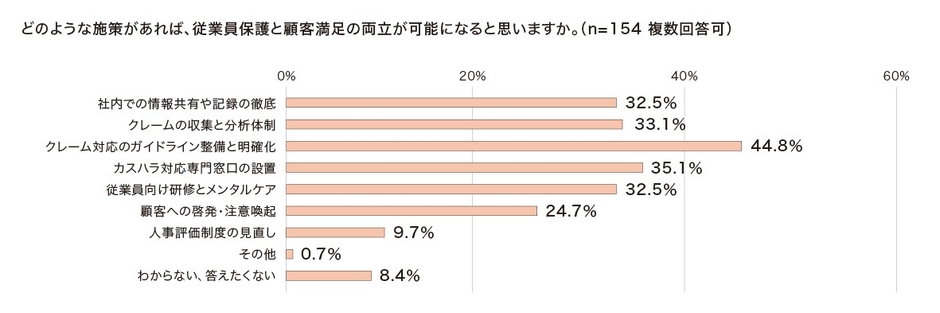 ■従業員保護と顧客満足のバランスについて両立可能かどうかを聞いたところ、「両立できない」と回答した人は154人だった。「両立できない」と回答した人に、追加の質問として、両立のために必要な施策について聞いたところ、「クレーム対応のガイドライン整備と明確化」(44.8%)と「カスハラ対応専門窓口の設置」(35.1%)の施策に期待する人が多かった。