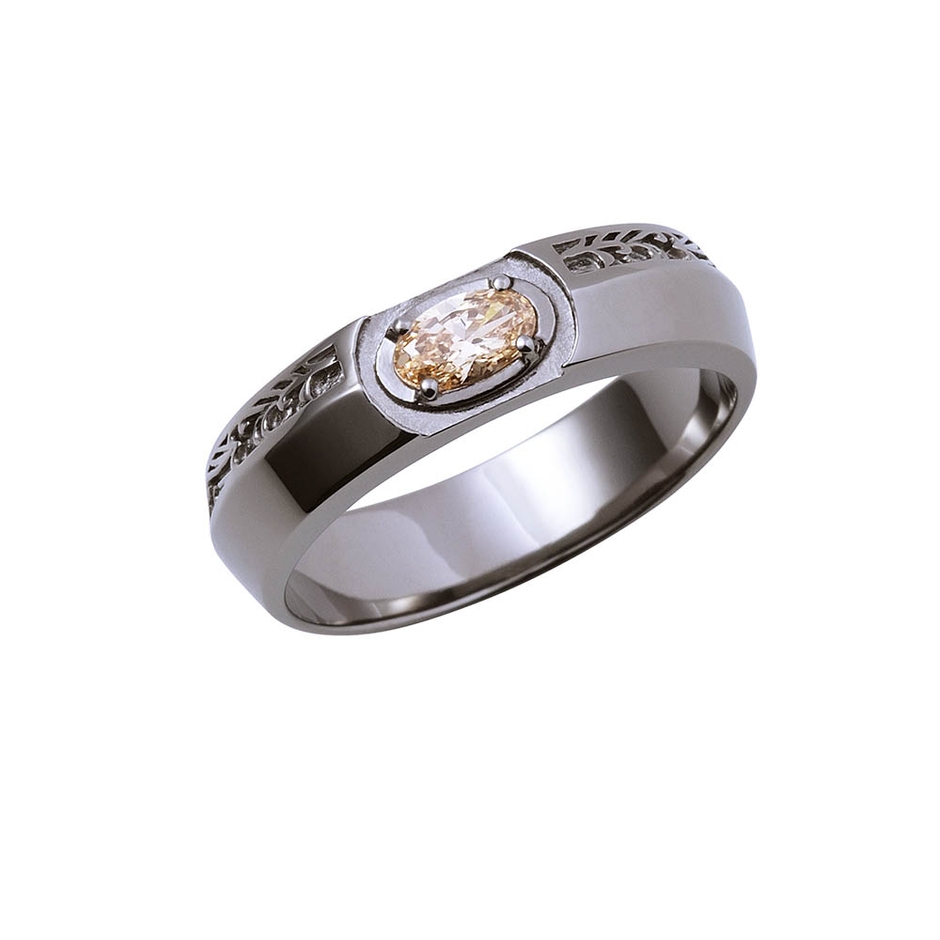 正岡の指環(刃)は上品なブラックコーティングを施したナイフエッジの型に、オーバルカットのイメージカラーストーンを配しました。存在感がひき立つデザインです。