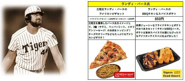全長約50cmにもなるバット型クッションには、バックスクリーン3連発を放った当時のプレーシーンがデザインされています!ランディ・バース氏の「ランディ・バースのBBQチキン&スパイスポテト」をはじめ、各世代を代表する阪神タイガースOBとコラボした「レジェンズコラボグルメ」をこの機会に是非ご賞味ください。